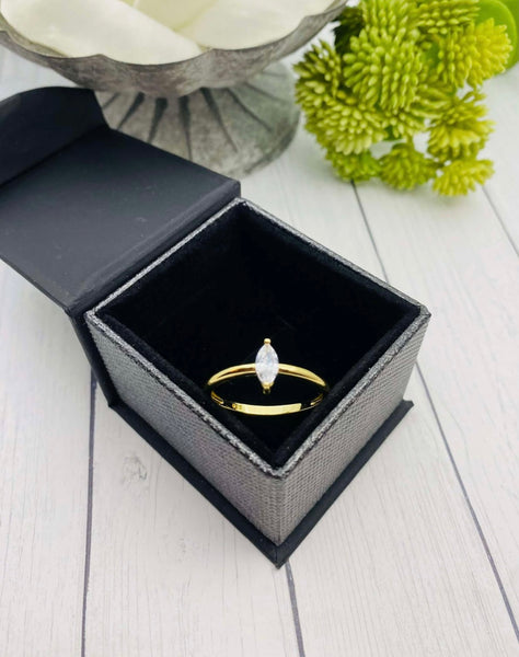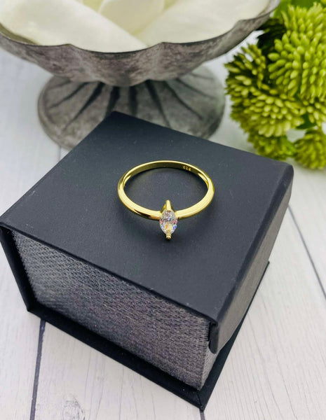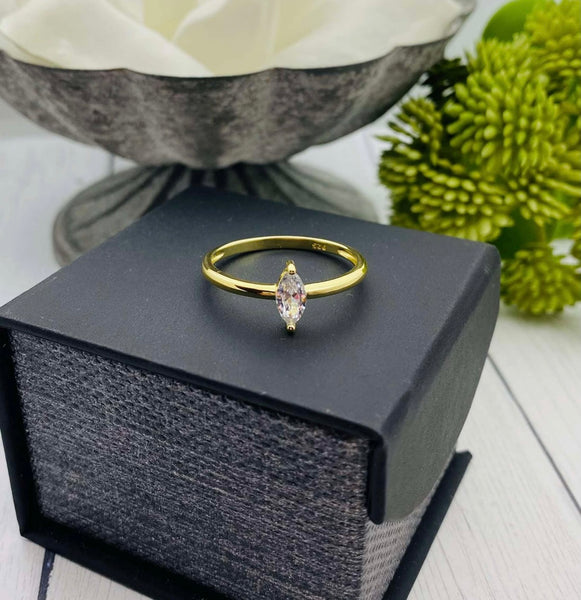 This beautiful and dainty marquise ring is available in thick and durable rhodium plated .925 sterling silver or 14K gold plated .925 sterling silver. The CZ stone is approximately 4x8mm.