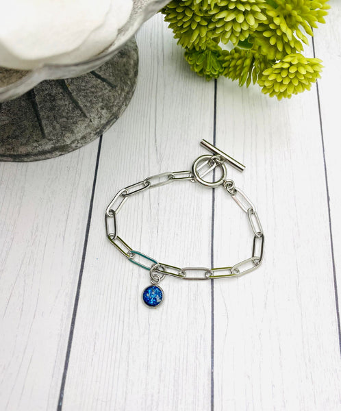This beautiful and durable stainless steel cremation bracelet will be created with your loved one's ashes. The dainty cremation stone measures approximately 6mm.